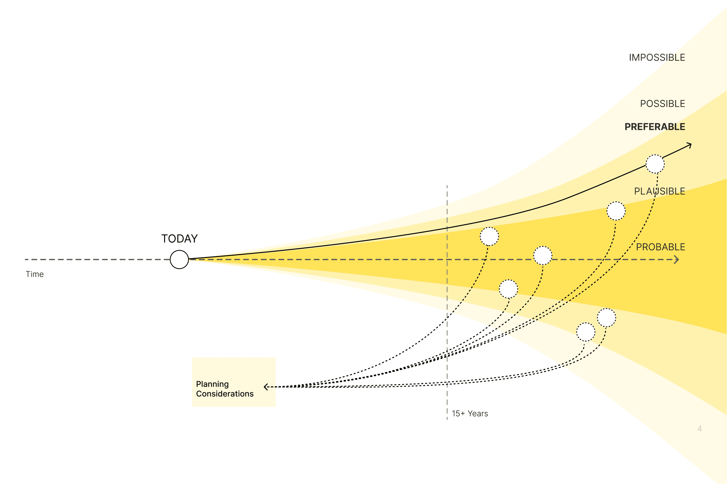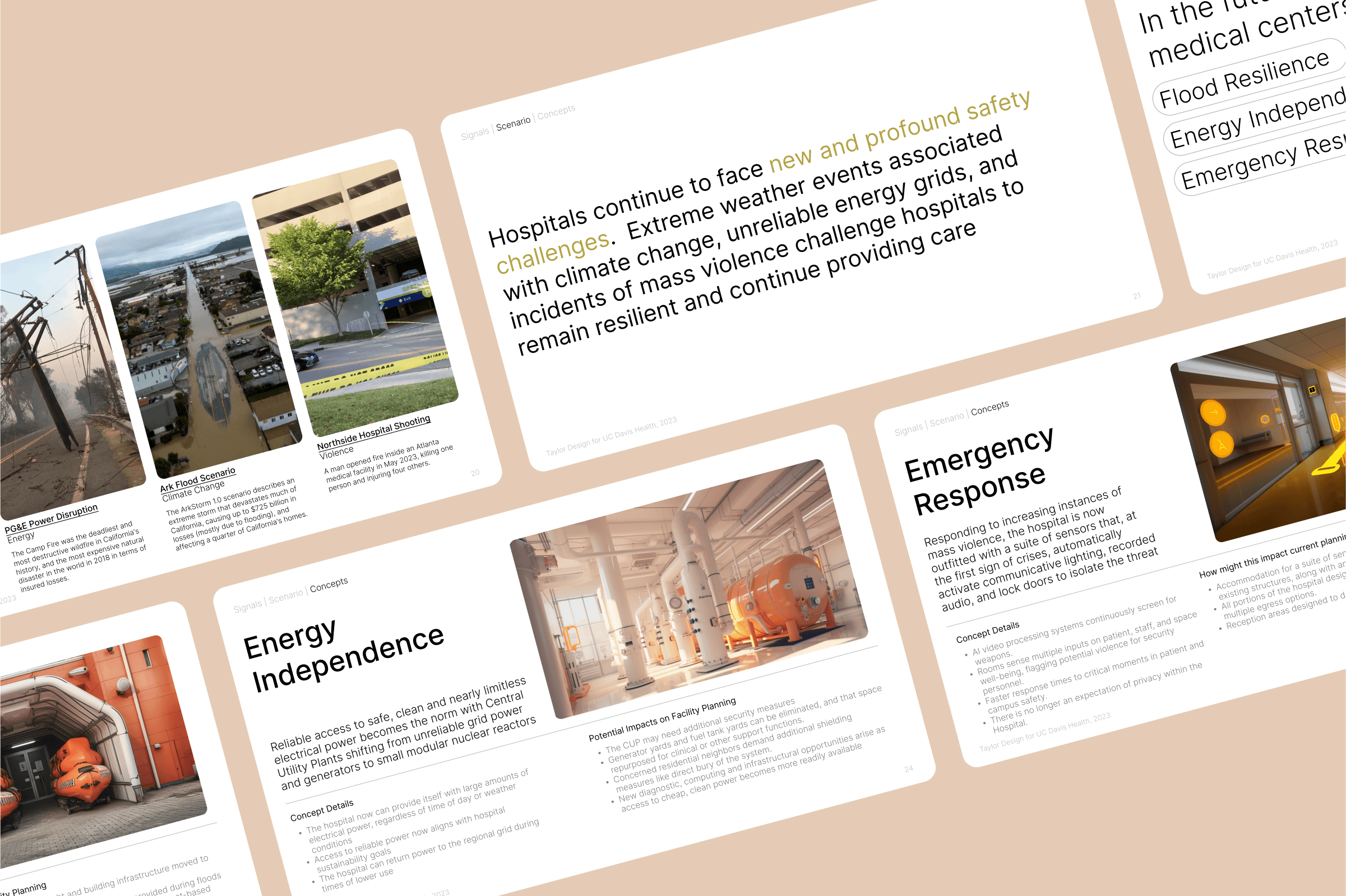Planning for 2060 might seem like "flying cars" futurism, but our approach was grounded in reality. We consulted 15 thought leaders from large academic medical centers and analyzed research papers and news to create five future scenarios. These scenarios considered factors like technology, climate change, and population growth. Each was visualized with design mockups and contextualized with its impact on UC Davis Health's physical master plan.
